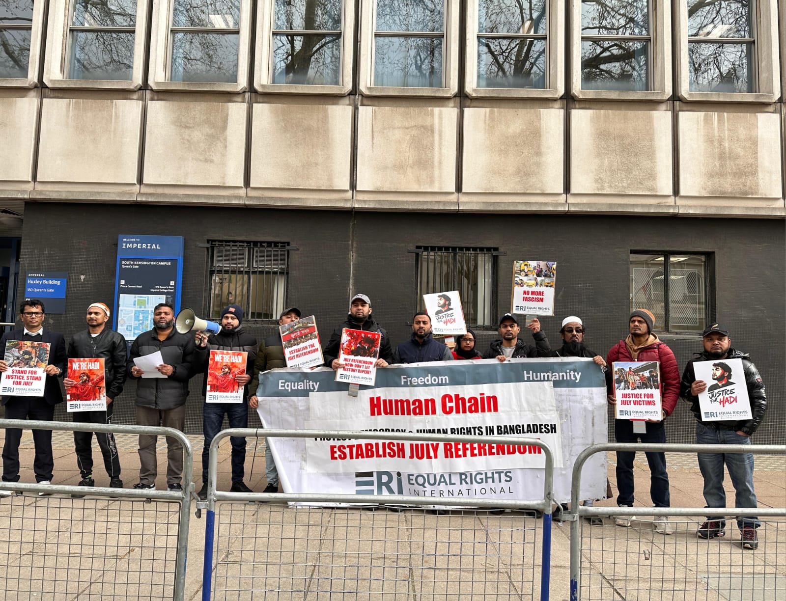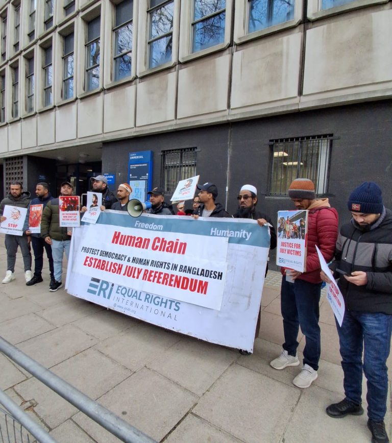 বাংলাদেশ হাই কমিশনের সামনে Equal Rights International কর্তৃক এক বিশাল বিক্ষোভ সমাবেশ অনুষ্ঠিত হয় সোমবার, ৩০ মার্চ ২০২৬। “Protect Democracy and Human Rights in Bangladesh: Establish July Referendum” শীর্ষক এই সমাবেশটি সংগঠনের সহ-সভাপতি মোহাম্মদ ওসমান গনি এবং সহ-সভাপতি মোঃ হাসনাত আল হাবিবের যৌথ পরিচালনায় অনুষ্ঠিত হয় এবং সভাপতিত্ব করেন সহ-সভাপতি মোঃ রোকতা হাসান। এতে উপস্থিত ছিলেন ইনকিলাব মঞ্চ ইন্টারন্যাশনাল এর সভাপতি নিজামুদ্দিন, স্ট্যান্ড ফর হিউম্যান রাইটসের অফিস সম্পাদক সৈয়দ জুয়েল ।উক্ত বিক্ষোভ সমাবেশ প্রধান বক্তা হিসেবে উপস্থিত ছিলেন ইআরআই এর সহ-সভাপতি মো: ইমাম হোসাইন, এবং বিশেষ বক্তা হিসেবে বক্তব্য রাখেন সেক্রেটারি জেনারেল নওশীন মোস্তারি মিয়া সাহেব।